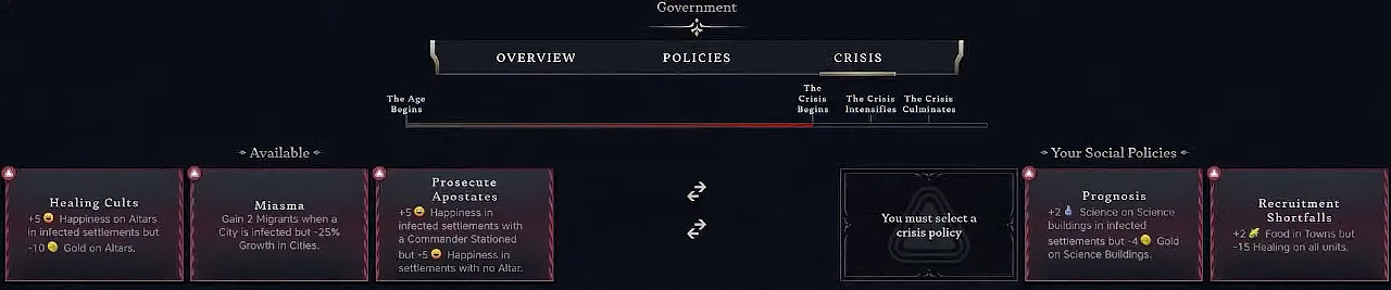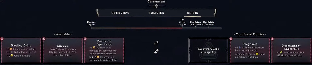 As the Age nears its end, each empire must endure a Crisis that occurs in three stages. For each one, you must select a negative Social Policy from an available pool. These penalties are cumulative and will stay with you until the end of the Age. A Crisis cannot occur in a final Age (or a single Age game), so there are currently no Modern crises... but this may change if they add a fourth Age in later DLC.