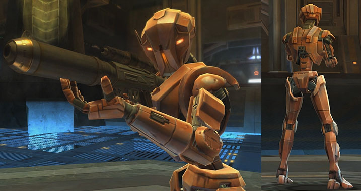 This HK-series assassin droid achieved infamy just before the Jedi Civil War. Although outwardly resembling a Systech Corporation unit, he was actually built by Darth Revan as a method of silencing political opponents. HK-47 has had many masters besides Revan, as well--corporate figures, crime lords, Hutts and Mandalorians--who have tried to harness his assassination protocols, usually with disastrous results. Three centuries ago, after being found and repaired by the Jedi Exile, HK-47 helped defeat the Sith Triumvirate. After the fighting ended, he was kept in trust by the re-formed Jedi Order, much to his dismay; with the galaxy still in turmoil, the Jedi were concerned that HK-47 would start "helpfully" removing troublesome individuals. Then, during routine maintenance, an engineer accidentally activated an unknown command in HK-47's systems. Soon after, the droid disappeared from Jedi custody and left for deep space. The Jedi's records claim that HK-47 has been destroyed and rebuilt several times since his creation. Darth Malgus's agents are said to have recently recovered HK-47's components from a mysterious facility built into an asteroid. Now reassembled and upgraded, HK-47 has become one of Darth Malgus's most formidable weapons. |