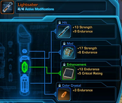 In earlier beta versions, lightsabers had more specifically-named socket types (emitter matrices, power crystals, focus lenses, etc.) similar to the KOTOR assembly system, but these have been replaced by the more generic "Mod" and "Enhancement" sockets.